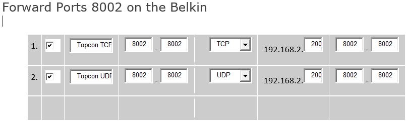 Since the default TCP port for most Topcon Reference Station receivers is 8002, this is what we will want to forward. However, there may be occassions where 8002 is not available. If this happens you will need to change the default port in the Topcon receiver to what port you are able to use.