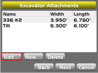 • ​After navigating to the Excavator Attachments screen, select the current bucket being used and press the Edit button.