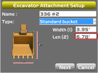 • Using the Next button scroll through the next several screens until the Excavator Attachments Screen appears.
