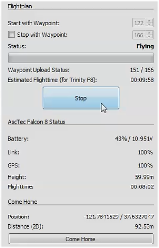 • 4. Within AscTec Navigator, click START.  The button will change to Stop and the software will begin transmitting waypoints to the Falcon 8 UAV, and it will begin flying the programmed flight plan.   A flight plan can always be interrupted by taking over controls with the MGS or by pressing STOP