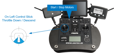 • To start or stop the motors keep the LEFT CONTROL STICK completely down.