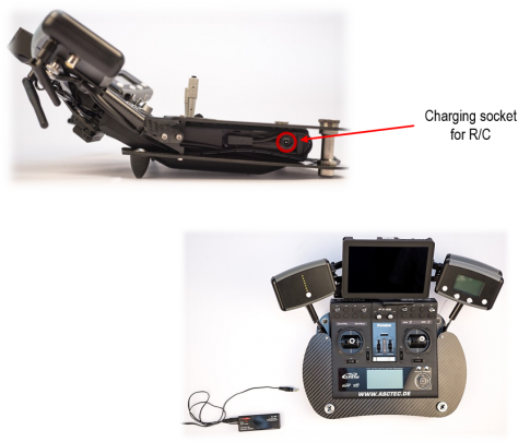 - Connect the charger with the charging socket on the remote control. During the charging process a red LED on the charger is lit.