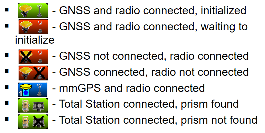 Survey: Collects new data or stakes out the currently loaded data. Can also be used to connect/disconnect from a GNSS receiver or total station. Total station prism tracking is enabled/disabled here as well.